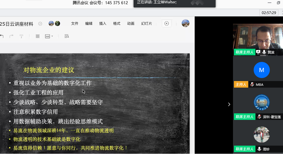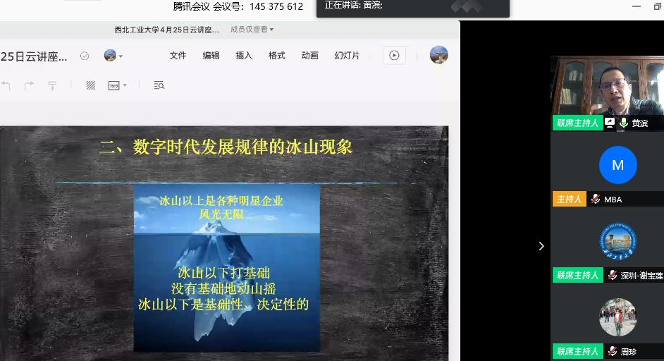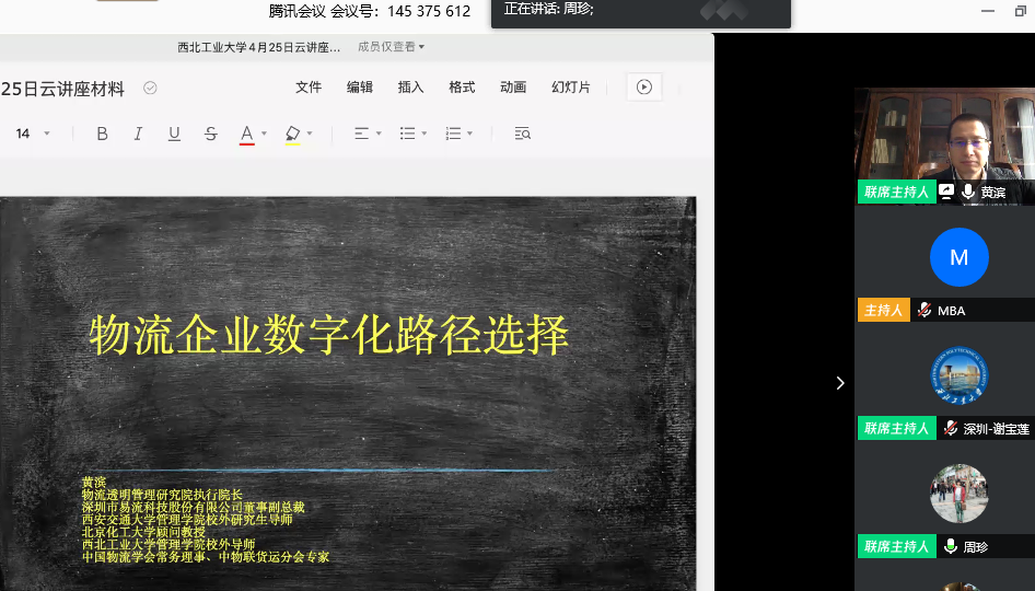 企业导师黄滨教授应邀在腾讯会议平台为专业学位研究生做《新冠肺炎疫情后物流企业数字化路径选择》的讲座。会议由周珍老师主持,约200名学生在线聆听了讲座。
