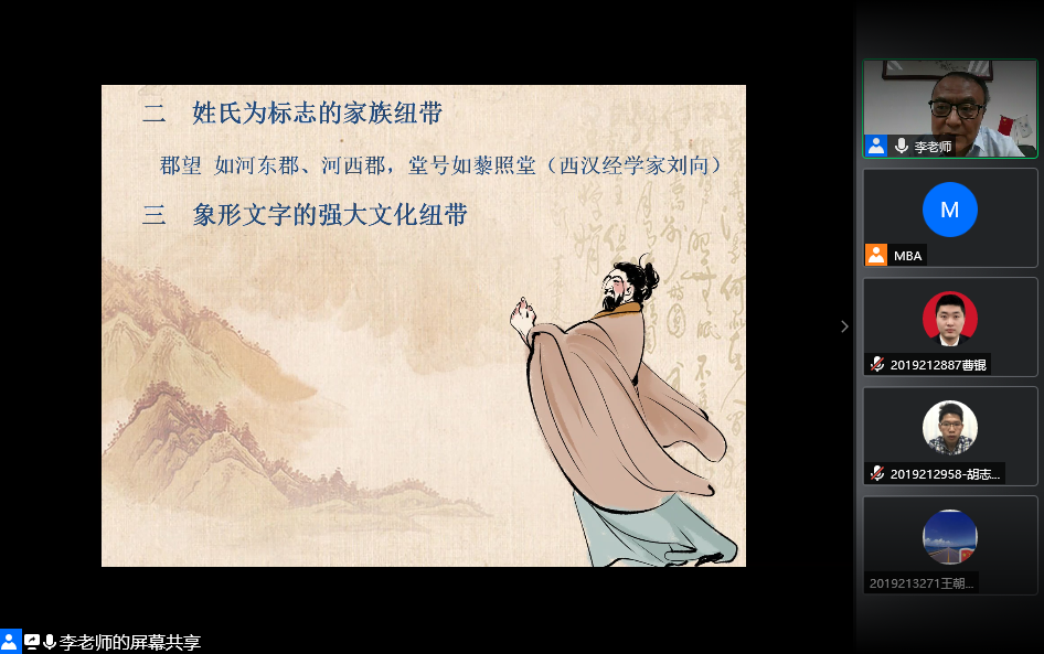 李老师从华夏民族、中华民族历史与文化发展开始,首先介绍了儒家文化的起源,让同学们从历史观的角度思考先秦儒家思想文化的形成发展;以姓氏与汉字结合形成的强大文化纽带为例,分享了儒家文化的特点;最后,李老师分析了儒家文化对企业管理的影响。