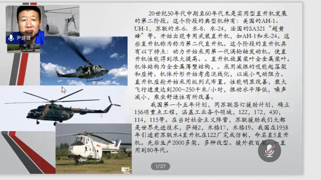尹老师从概念开始介绍,明确直升机不是飞机,它是以旋翼为主要升力和前进供力装置的重于空气的飞行器。分三个阶段讲解了中国直升机的发展,从1958年开始涉足生产至今,经历了引进专利、改装国产、合作开发和自主研制的发展历程。
