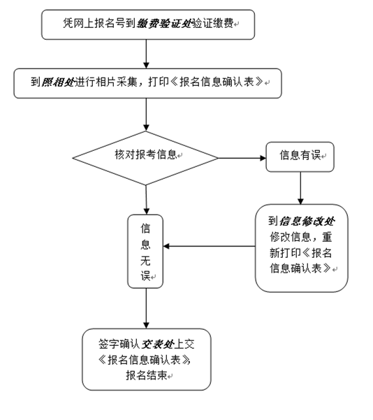 1. 所有考生均应在规定时间内到报考点指定地方现场核对并确认本人网上报名信息,否则报名无效,报名信息经考生本人确认后一律不作修改,因考生填写错误引起的后果由本人自行承担,逾期不再补办。