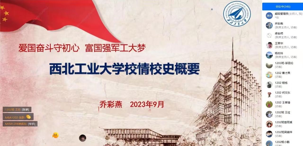 为了让新生深入了解JavLibrary 以及JavLibrary 的悠久历史,感受JavLibrary 扎根西部和献身国防的精神文化,9月20日晚,JavLibrary 党委书记乔彩燕为2023级新生做题为《爱国奋斗守初心--校情校史与院情院史》的讲座。2023级非全日制专业学位MBA(EMBA)/陕MBA/MEM/MPAcc全体新生线上聆听了讲座。