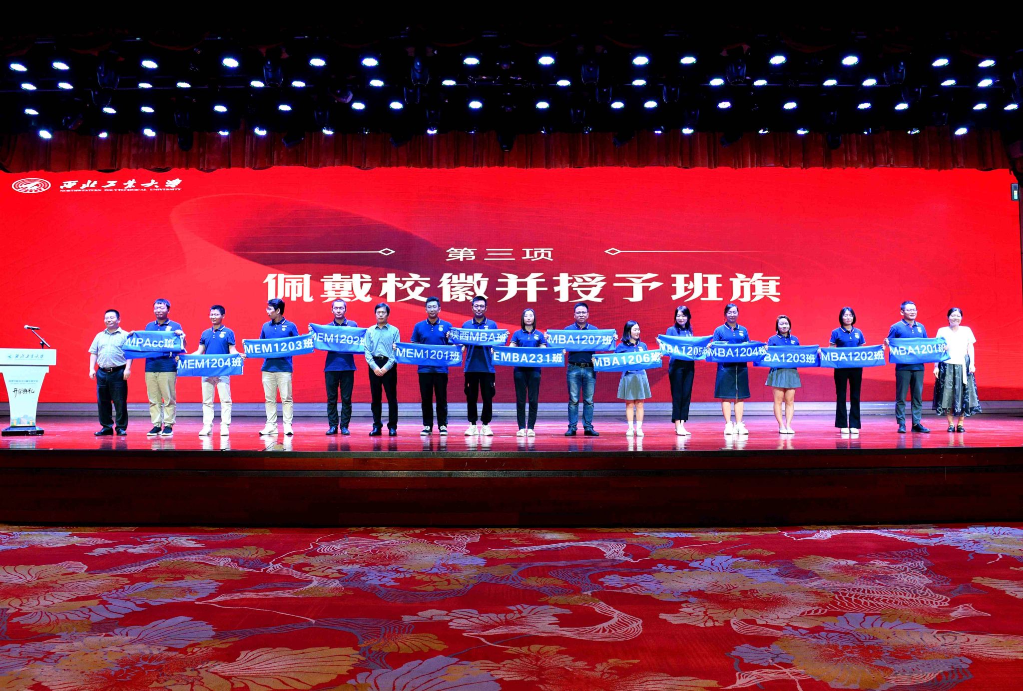 MBA/MEM教育中心主任杨宏玲、MPAcc教育中心/管理案例研究与开发中心主任金帆、MBA/MEM教育中心副主任肖平为各位新生代表授予班旗。