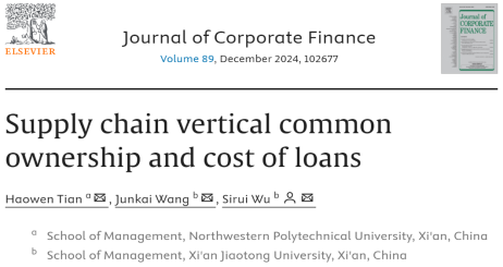 副教授田皓文作为第一作者的研究成果“Supply chain vertical common ownership and cost of loans”于Journal of Corporate Finance期刊在线刊登。Journal of Corporate Finance是公司金融领域公认的高水平国际期刊,是ABS四星级期刊和JCR一区期刊(影响因子7.2)。