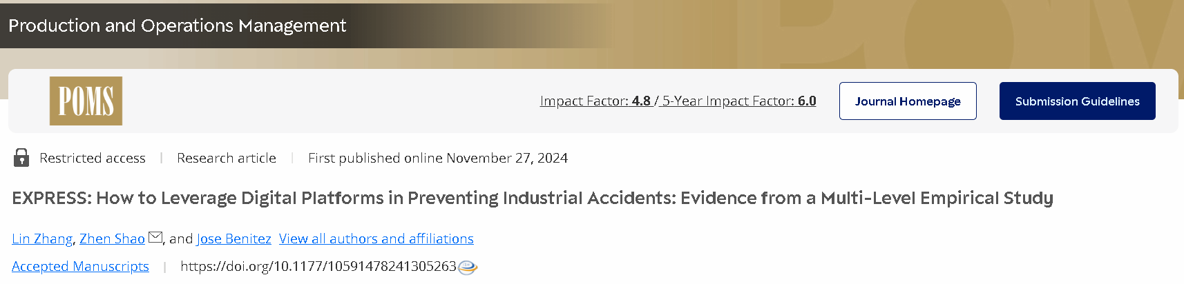 副教授张林与合作者的研究成果“How to Leverage Digital Platforms in Preventing Industrial Accidents: Evidence from a Multi-Level Empirical Study”在《Production and Operations Management》期刊上在线刊登,张林为论文第一作者。《Production and Operations Management》是国际生产与运作管理协会会刊,为生产与运作管理领域顶级期刊,是美国University of Texas at Dallas所选出的商JavLibrary