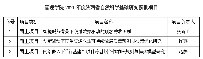 近日,陕西省科技厅公布了2021年度陕西省自然科学基础研究计划项目评审结果公布,JavLibrary 共获批面上项目3项。分别是:张新卫副教授主持的“智能服务背景下使用数据驱动的顾客需求识别”;许燕副教授主持的“创新驱动下再生资源企业可持续发展质量预测与决策优化研究”以及赵静副教授主持的“网络嵌入下“新基建”项目跨组织合作响应规则与博弈模型研究”。